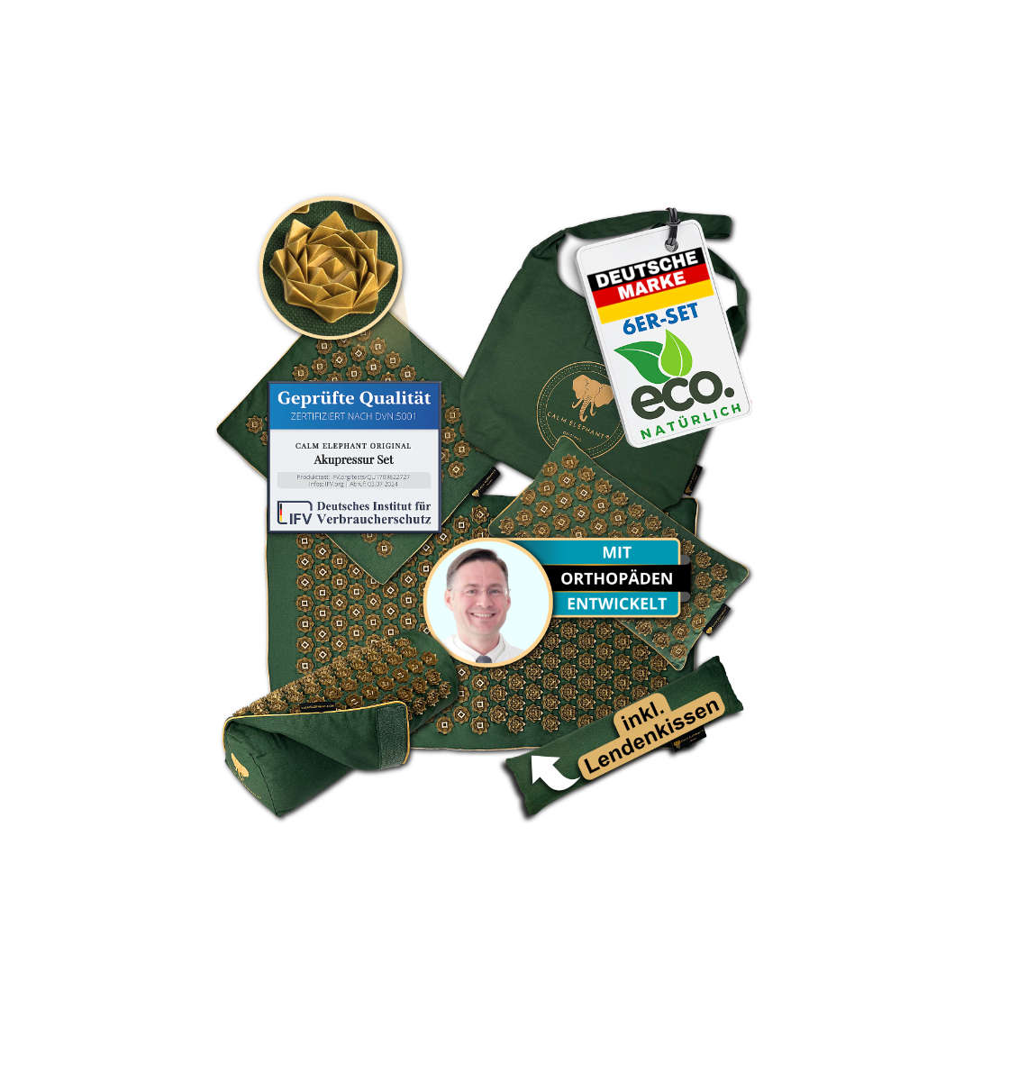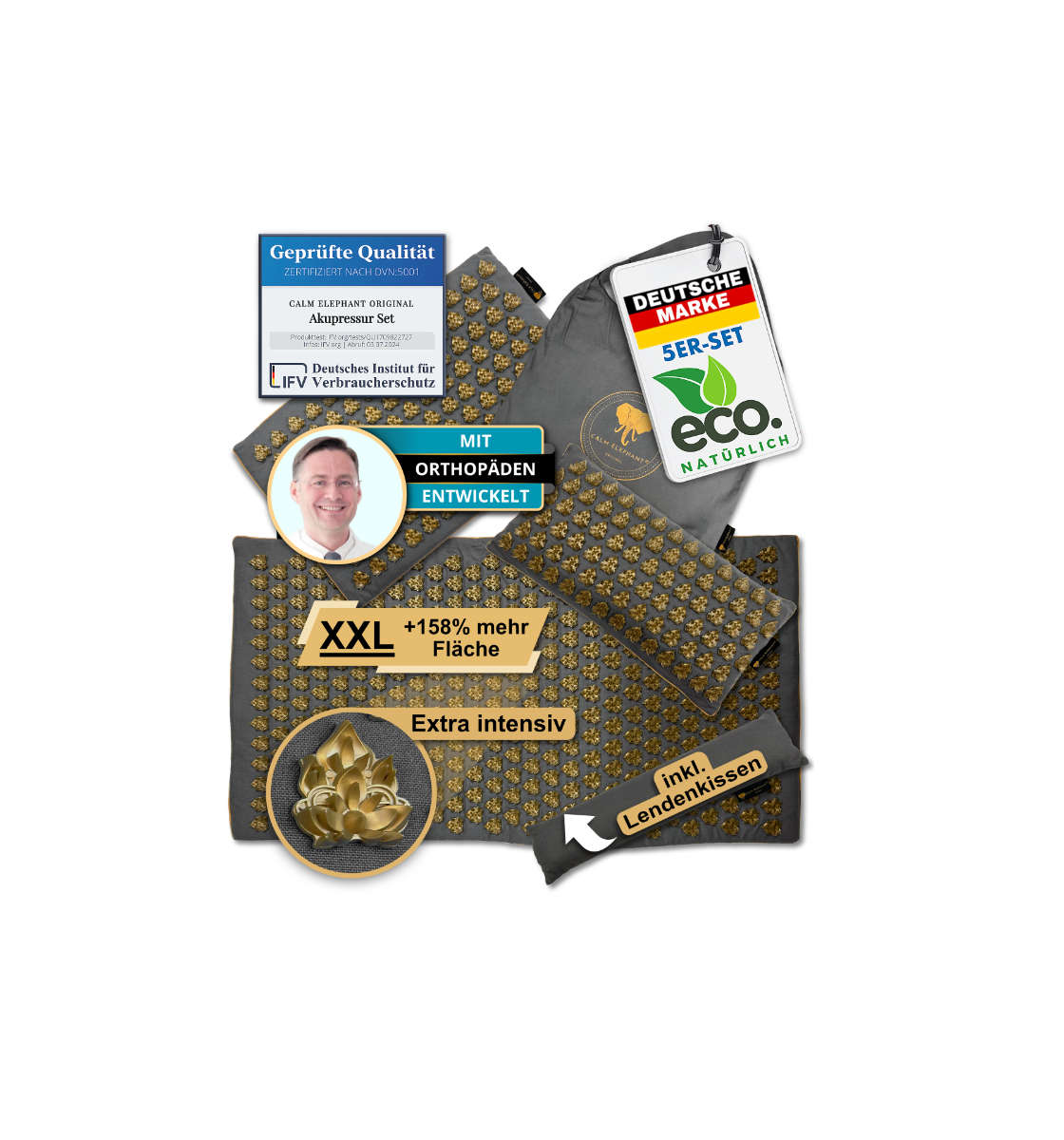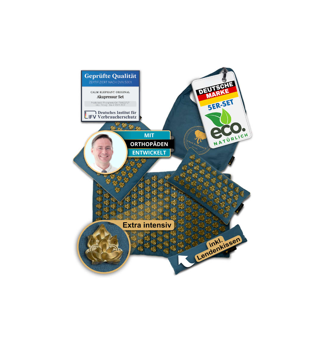 Die Akupressurmatten von CALM ELEPHANT wurden mit Unterstützung von Orthopäden und Physiotherapeuten entwickelt. Wir achten bei der Produktion auf einen nachhaltigen Prozess und hochwertige Verarbeitung von natürlichen Materialien wie Leinen, Kokosfaser und Buchweizen. Um dir bei der Auswahl der für dich richtigen Matte zu helfen, beiten wir einen praktischen Produktfinder für die CALM ELEPHANT Akupressurmatten. Natürlich bieten wir auch einen telefonischen und einen E-Mail-Support an, wenn du Fragen hast.